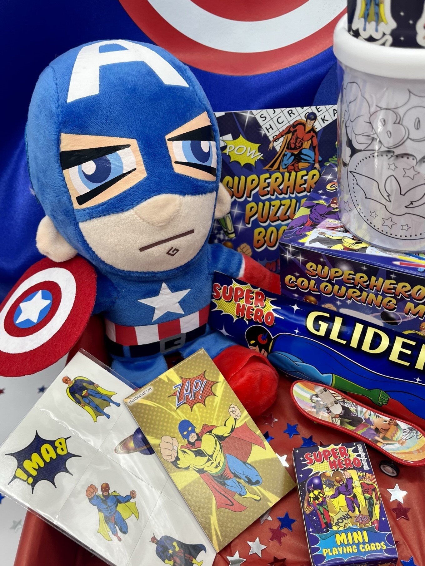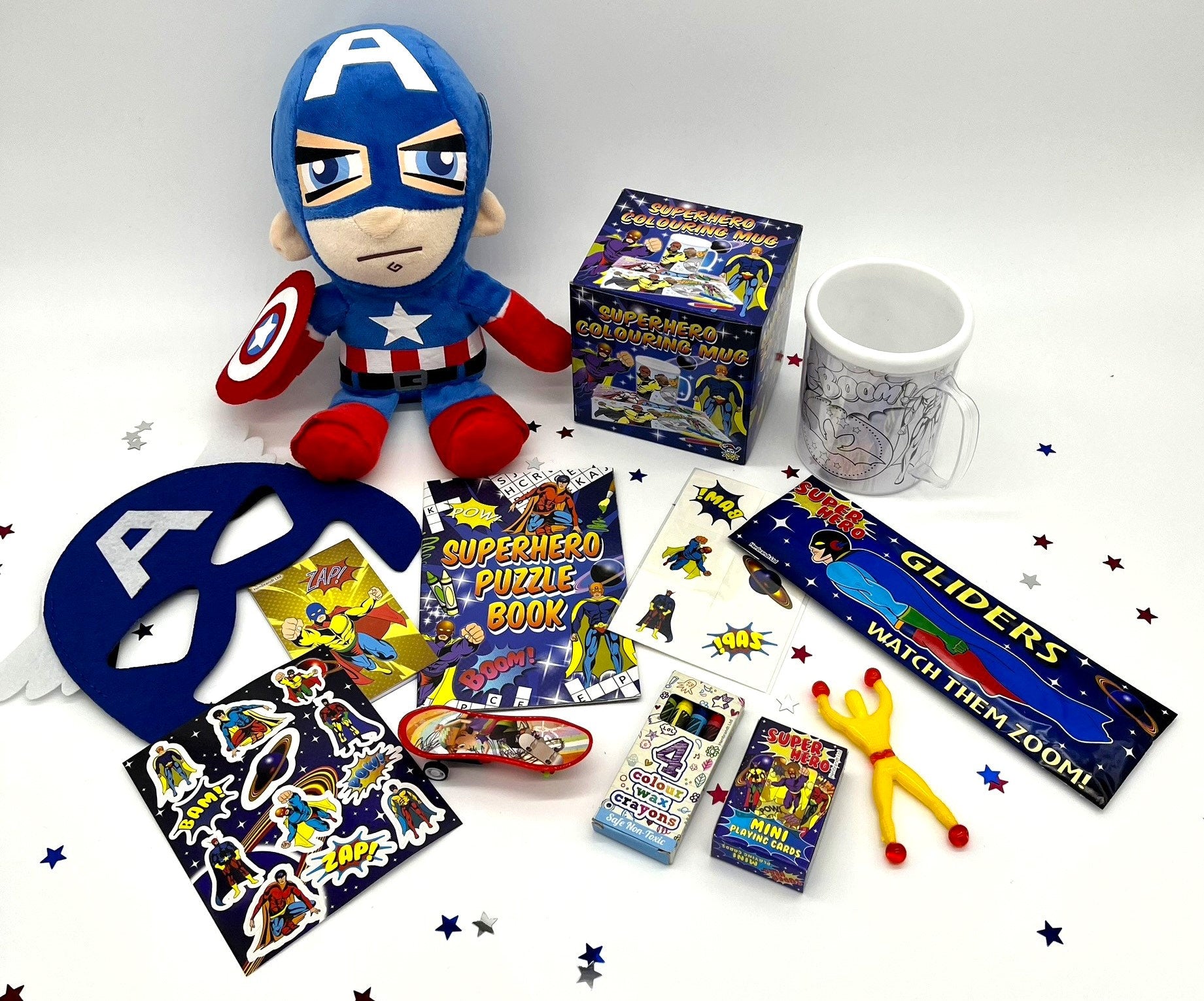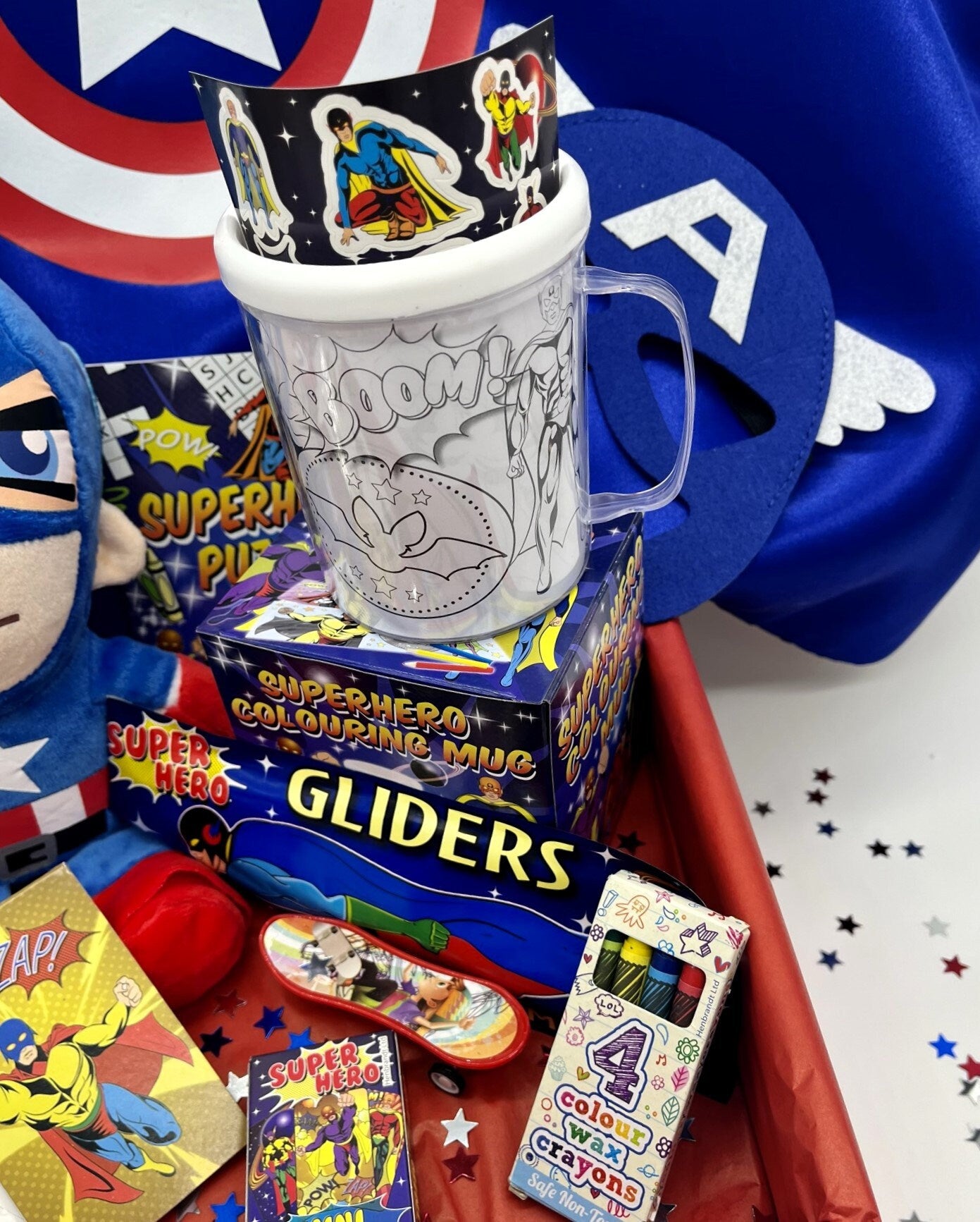 Looking for the ultimate gift for your little superhero? Check out our Superhero Gift Box! It's packed with everything a kid needs to unleash their inner hero. Inside, you'll find a high-quality Superhero Mask and a Luxury Double Sided Cape that's perfect for all sorts of superhero activities. Plus, there's a cuddly Superhero Plush buddy to join in on the adventures. But that's not all – the creativity really flies with our Paint Your Own Mug kit and let's not forget the Stickers and Activity Book that are bursting with fun challenges and puzzles. For the finishing touch, we've included some cool temporary tattoos.