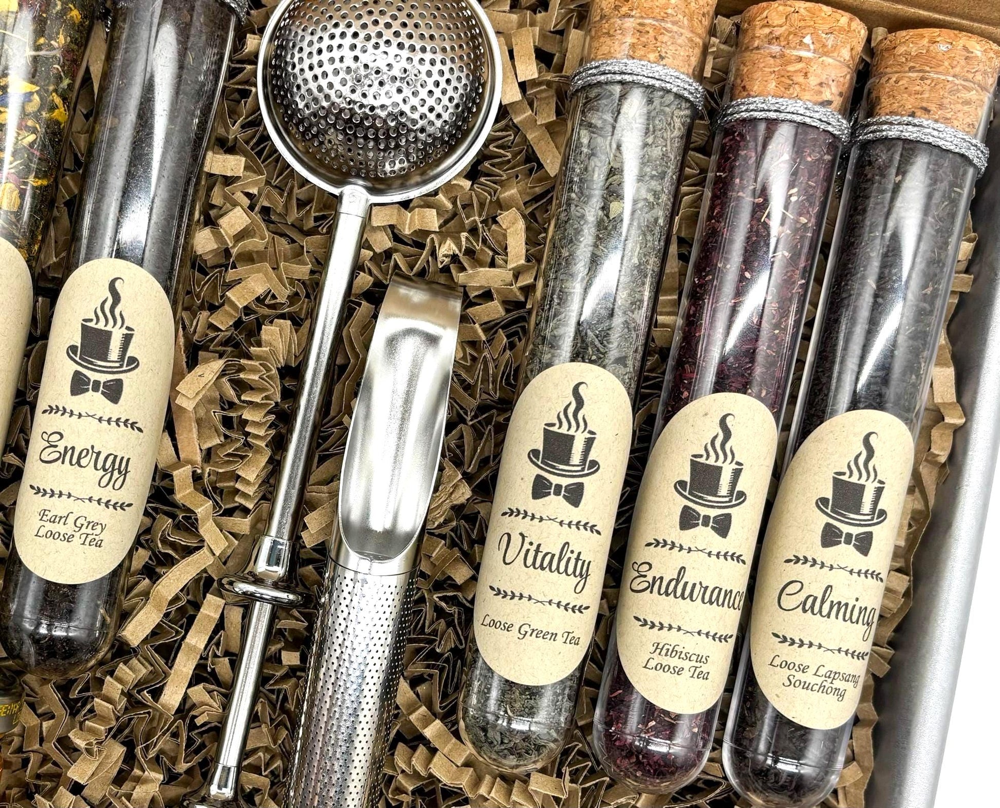 Indulge the tea enthusiast in your life with the Gentleman's Tea Tasting Gift Box – a sophisticated collection crafted for the modern man seeking calm, strength, and vitality. This elegant gift box houses six premium loose leaf teas, each with a unique blend to match his mood. From the smoky, rustic charm of Lapsang Souchong, reminiscent of wood-burning stoves and peaceful forest walks, to the smooth, malty appeal of a classic breakfast tea designed to awaken your senses. These teas are more than a drink; they’re a journey into timeless, sophisticated flavors and invigorating aromas. Paired with two stainless steel infusers, a drizzle of pure honey, and eco-friendly cork-sealed vials, it’s a perfect blend of luxury and practicality. Ideal for gifting on birthdays, Christmas, or as a self-care treat,