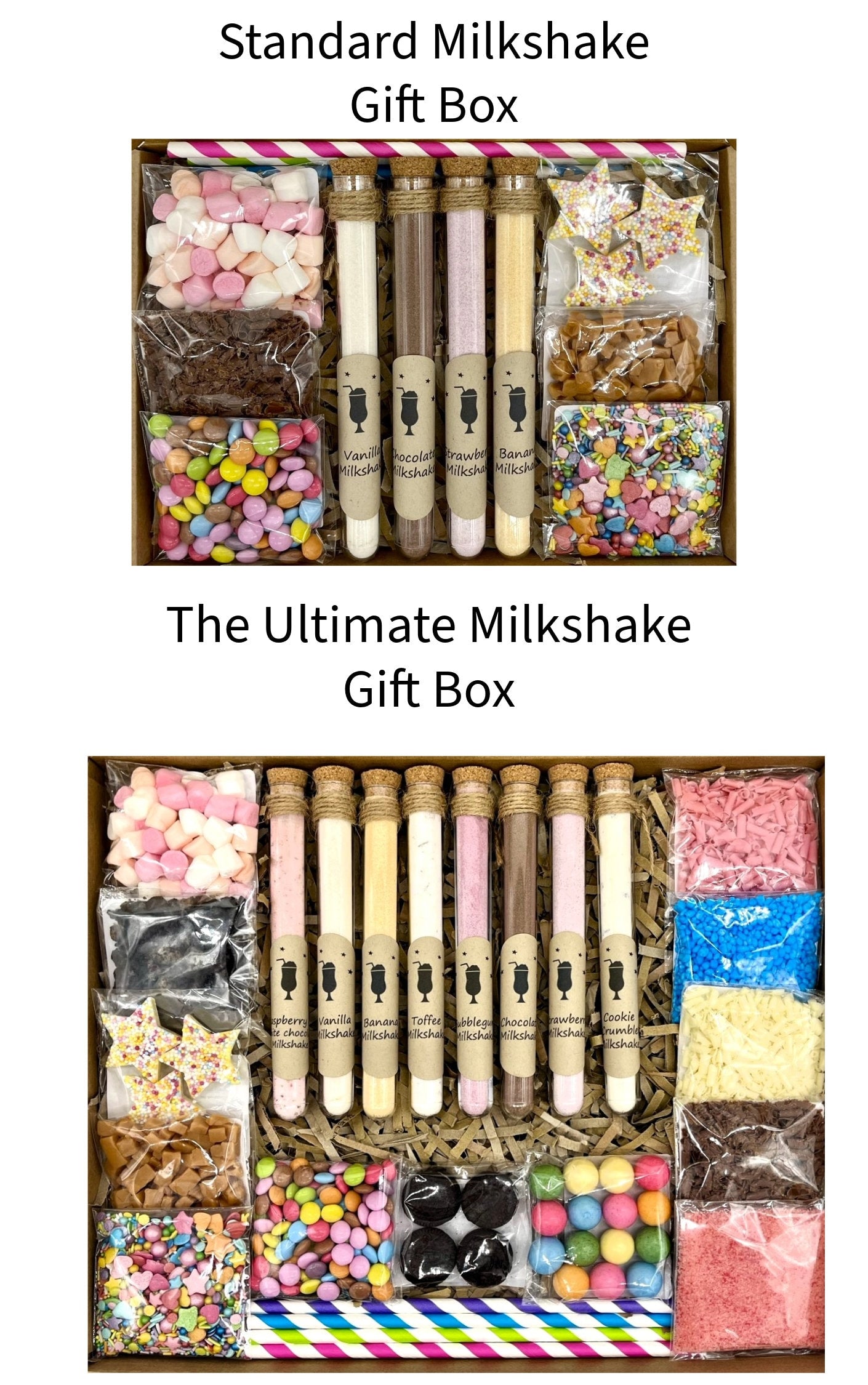 Our luxury, fun MILKSHAKE gift Box is the perfect gift to send this year. Ready for Christmas despatch now!!! Containing delicious Strawberry, Chocolate, Vanilla & Banana Milkshake Powders, a variety of Toppings and paper straws. Just add a 20ml scoop of powder to ice cold milk and mix/blend for 30 seconds to give you a milk shake or 45 seconds for a smooth thick shake. Pour into a cup and add a topping of your choice. Make your own professional luxury drinks at home! Or try our New Ultimate Milkshake Gift Box which contains 8 Milkshakes inc Toffee, Bubblegum, Cookie & Raspberry & White Chocolate